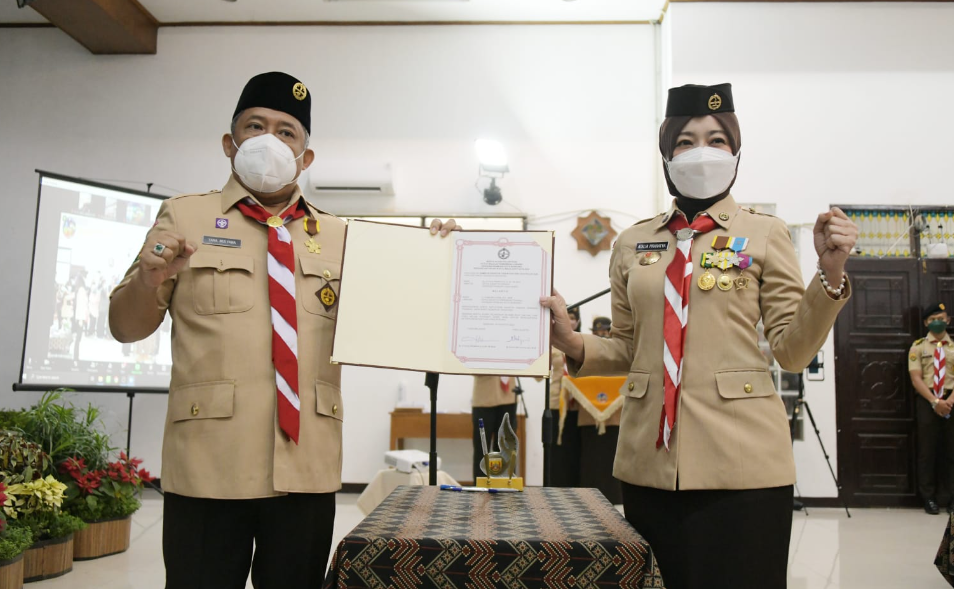 Bandung – Ketua Kwarda Jawa Barat, Kak Atalia Praratya melantik Walikota Bandung Kak Yana Mulyana sebagai Ketua Majelis Pembimbing Cabang (Mabicab) Gerakan Pramuka Kota Bandung di Gedung Kwarcab Kota Bandung, Kamis (25/8/2022).